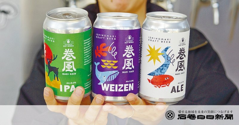 石巻発のクラフトビール醸造所のイシノマキホップワークス=石巻市中央=は5月1日から、主力商品の缶ビール「巻風エール」「巻風IPA」「巻風WEIZEN」のデザインをリニューアルする。【渡邊裕紀】