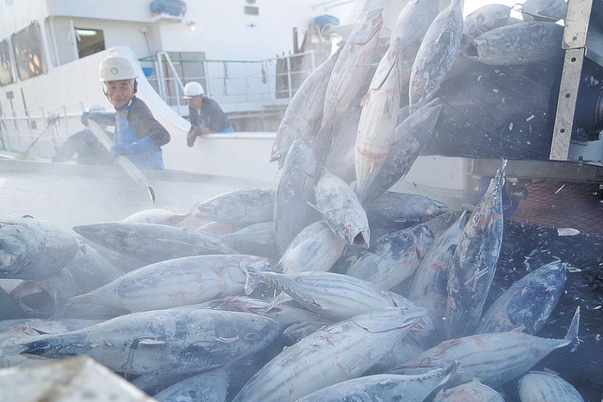 石巻に遠洋一本釣り船 高鮮度冷凍カツオ水揚げ