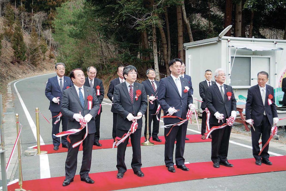 県と両市町の関係者約30人が出席した式典では、須田善明町長が「1本のう回路があることで安心感がある。森林の利活用は事業を興す上でも意義深く、石巻市と林道の維持活用で連携していく」とあいさつ。テープカットで開通を記念した。